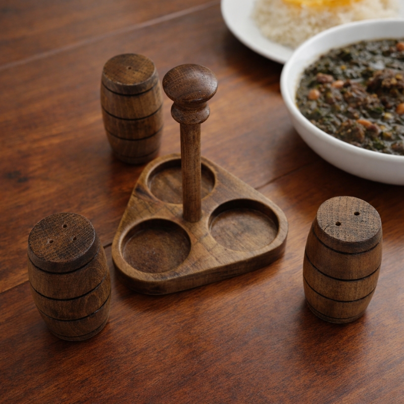 ست سنتی شامل یک سماق پاش با دو سوراخ، یک فلفل پاش با یک سوراخ و یک نمکدان با سه سوراخ است. این طراحی کنترل پاشش ادویه را آسان کرده و نوع آن را به راحتی قابل تشخیص میکند.